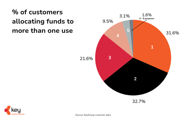 Around a third of customers (31.6%) used their plan for just one purpose, often to clear an existing mortgage or repay existing debts. But for the majority, the picture is far more varied. The largest group (32.7%) divided their release between two different uses, while another one in five (21.6%) spread funds across three priorities. Almost one in ten (9.5%) allocated their release to four or more purposes.