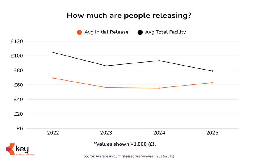 In 2025, the average initial release rose for the first time in three years, increasing +13.3% year-on-year to £62,930. However, the average total facility (initial release plus approved drawdown facility) fell to a four-year low of £78,942 — down 15.4% year-on-year and 24.5% since 2022.