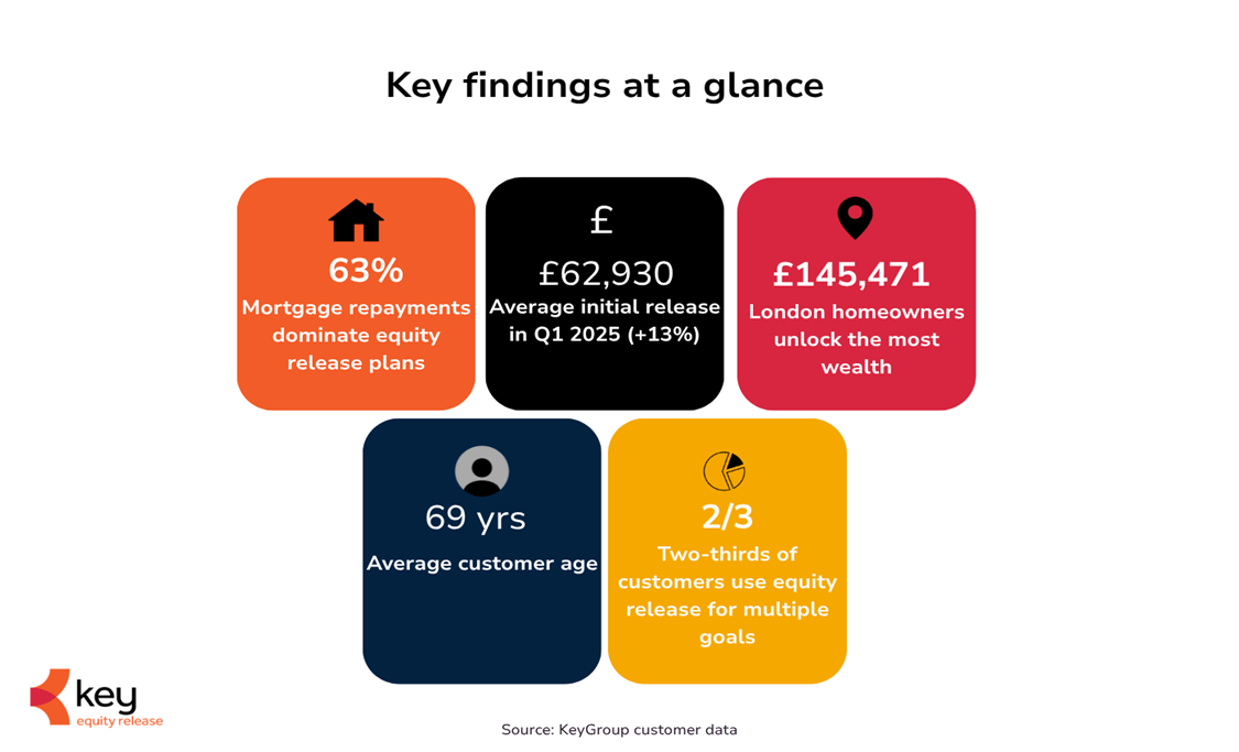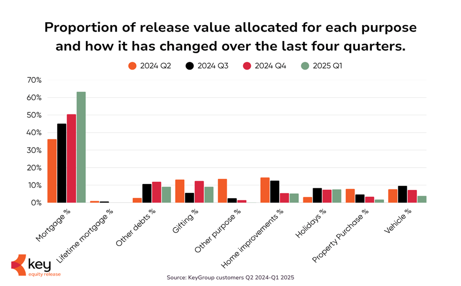 Mortgage repayments dominate: 63% of equity release plans in Q1 2025 were used to clear existing mortgages — up from 36% in Q2 2024.